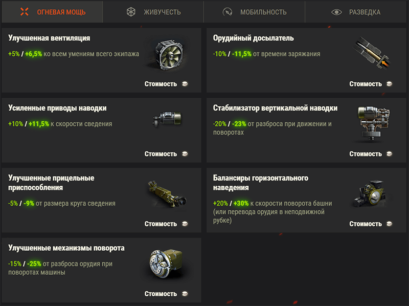 Улучшенная вентиляция повышает навыки вашего экипажа на 5% и влияет на такие параметры, как дальность обзора, время перезарядки, время прицеливания и другие стандартные показатели танка. Хотя бонус составляет 5%, на самом деле он не увеличивает конкретные значения, такие как время перезарядки, на 5%, а является меньшей величиной из-за того, что World of Tanks рассчитывает производительность на основе уровня и навыков вашего экипажа. Хотя это и не 5%, добавленное усиление практически всех аспектов вашего танка огромно, поскольку оно дает вам небольшое усиление по всем направлениям.