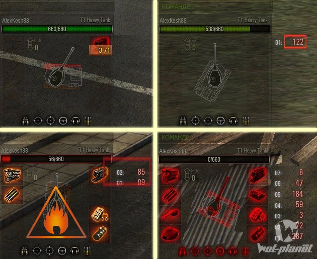 Этот мод представляет из себя очень удобную и в то же время информативную панель повреждений (невооруженным взглядом видно, что за основу была взята стандартная панель). Выглядит мод очень просто (и за счет этого занимает меньше места в оперативной памяти) и без особых наворотов, даже не смотря на то, что добавлен лог повреждений танка (который поможет вам определить технику противника, который по вам вёл огонь, или же просто увидеть сколько снаряд нанёс вам урона). Так же в модификацию добавили альтернативную анимацию пожара, которая значительно заметней стандартной.